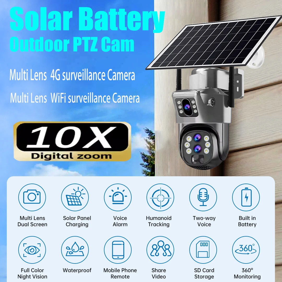 10X Optical Zoom 4G SIM Solar Camera 6K 12MP Three Lens WiFi Outdoor Surveillance Camera PIR Auto Tracking Solar Security CCTV